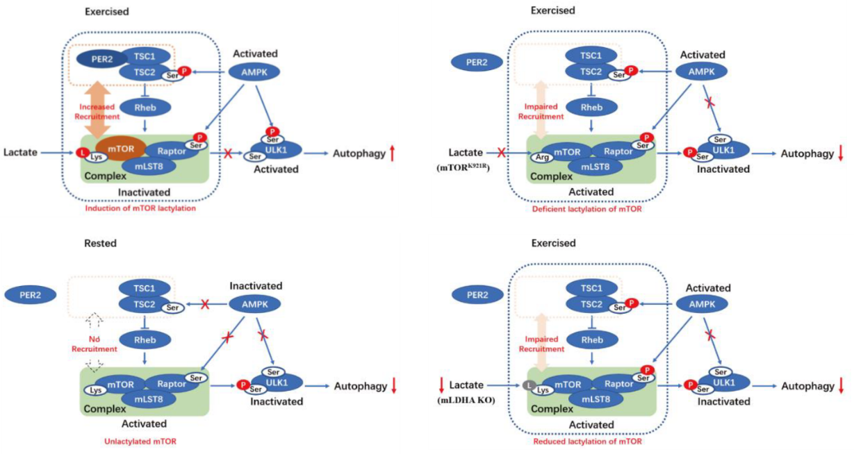 通過該項(xiàng)研究,研究團(tuán)隊(duì)提出以下工作假說(見下圖):運(yùn)動(dòng)導(dǎo)致骨骼肌乳酸迅速升高;升高的乳酸直接乳酸化修飾mTOR蛋白的K921位點(diǎn);此修飾協(xié)同AMPK的激活,共同抑制mTORC1活性;mTORC1的抑制進(jìn)而解除其對(duì)自噬啟動(dòng)的剎車作用,最終激活自噬,清理受損細(xì)胞器,維持肌肉健康。